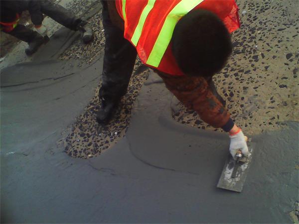 4.當(dāng)所有準(zhǔn)備工作都完成后,使用已經(jīng)攪拌好的水泥路面修補(bǔ)料對(duì)露石子部位進(jìn)行修復(fù),用抹子刮平材料,收光,整個(gè)修補(bǔ)過(guò)程應(yīng)該控制在30分鐘以內(nèi)。